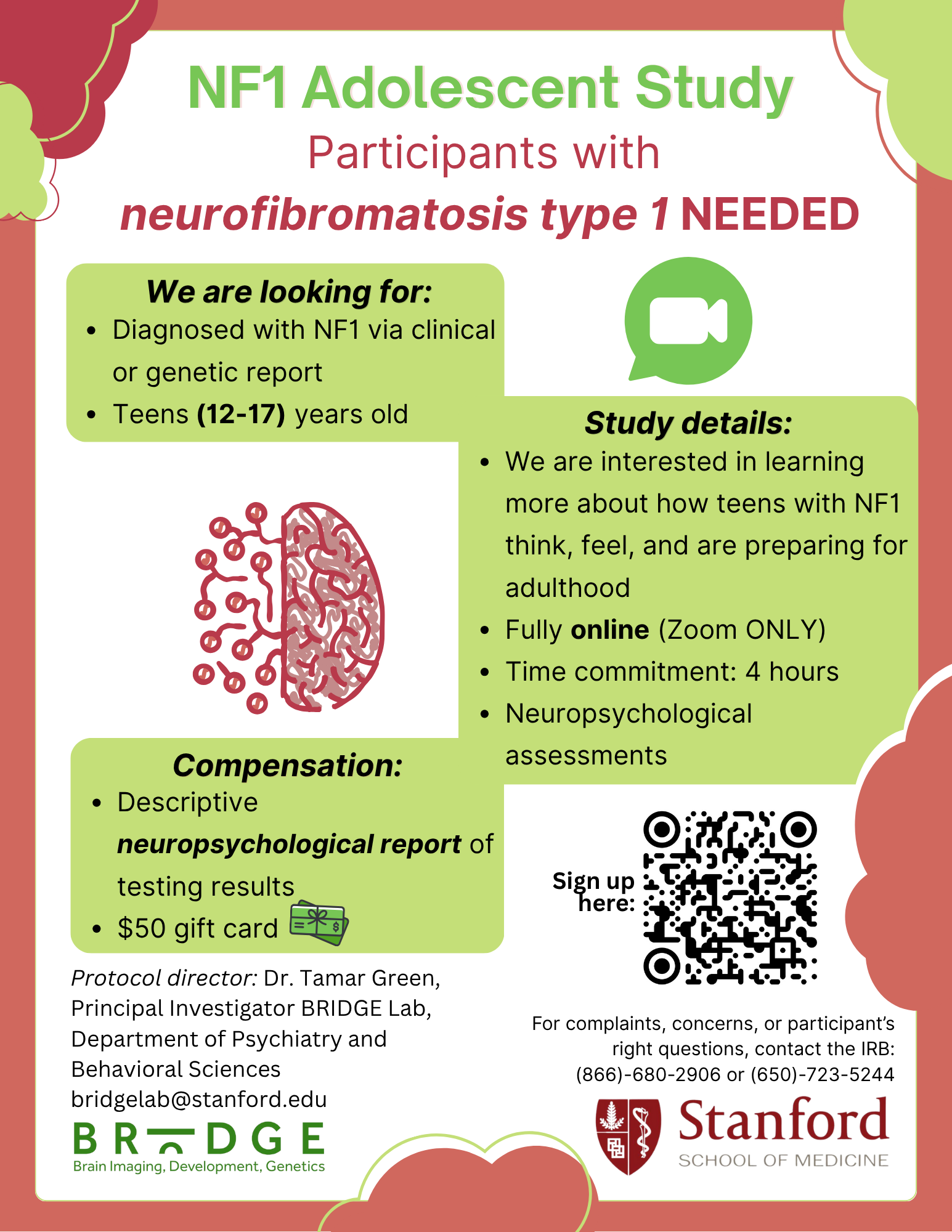 NF1 Adolesccent Study: Teens from 12 to 17 with a diagnosis of NF1 are needed for this research study. The objective of the study is to learn more about how teens with NF1 think, feel, and are preparing for adulthood. This study is online, and includes a neurpsychological report of testing and a $50 gift card. Protocol director is Dr. Tamar Green of BRIDGE Lab in Stanford's Department of Psychiatry and Behavioral Sciences.